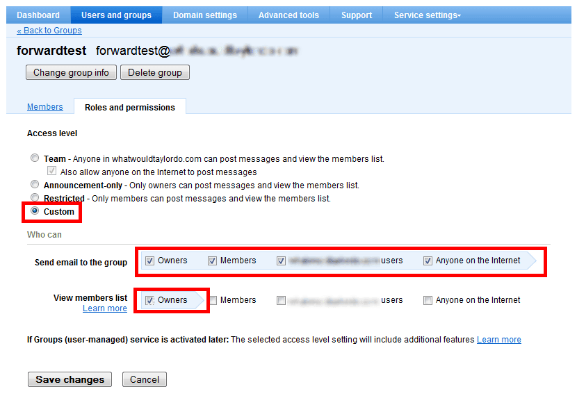 This next step is technically optional, but necessary if you’d like to restrict normal members from seeing the contents of the forwarder. If this is the case, we need to set custom permissions and de-select all but “Owner” for “View member list”. If this doesn’t concern you, feel free to skip this.