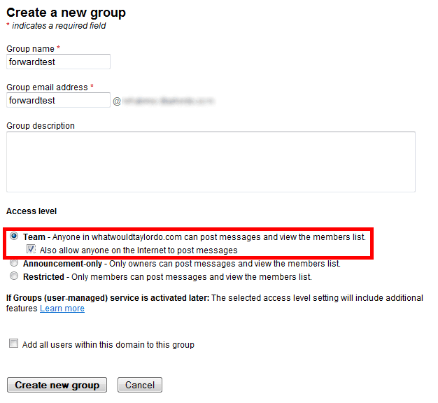 Enter the name and address of the group. Set the Access level to “Team” and check the checkbox labeled “Also allow anyone on the internet to post messages”. When done, click “Create new group”.