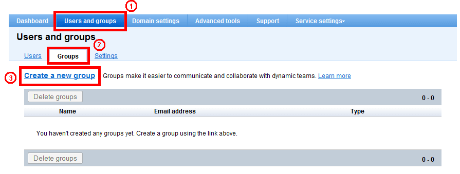 First, ensure that you’re in the right place by getting to the groups section. Select the “Users and Groups” tab, Groups sub-tab, then click on “Create a new group”.